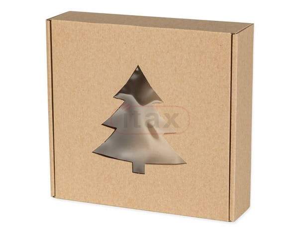 Karton pudełko ozdobne świąteczne brązowe 200x200x50 mm z okienkiem CHOINKA