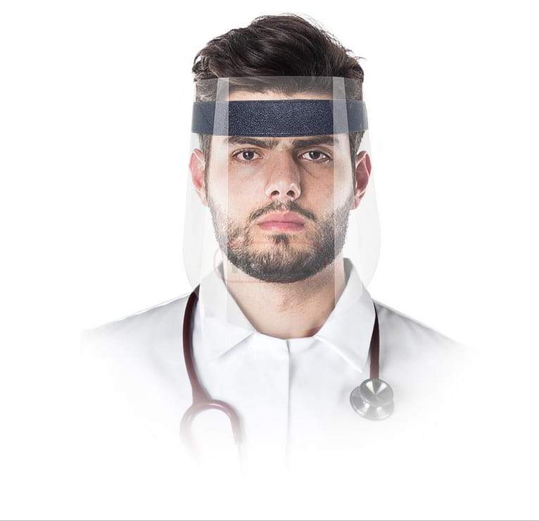 Osłona na twarz zwana również przyłbicą wykonana z tworzywa PET z wklejoną pianką o wymiarach: 40x220x15 mm tworzącą dystans pomiędzy przyłbicą a twarzą zwiększającą komfort użytkownika zakładana na elastyczną gumkę w kolorze czarnym o szerokości 25 mm, dzięki czeku doskonale dopasowuje się do głowy. Osłona błony śluzowej ust, oczu i nosa przed kontaktem z zanieczyszczonymi dłońmi, przedmiotami oraz drobnymi urazami mechanicznymi.
