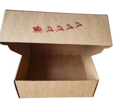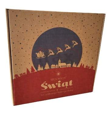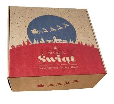 Karton wykonany jest z tektury mikrofali brązowej (fala E) o gramaturze 351 g/m2 z nadrukiem świątecznym. Idealny jako opakowania do pakowania prezentów.